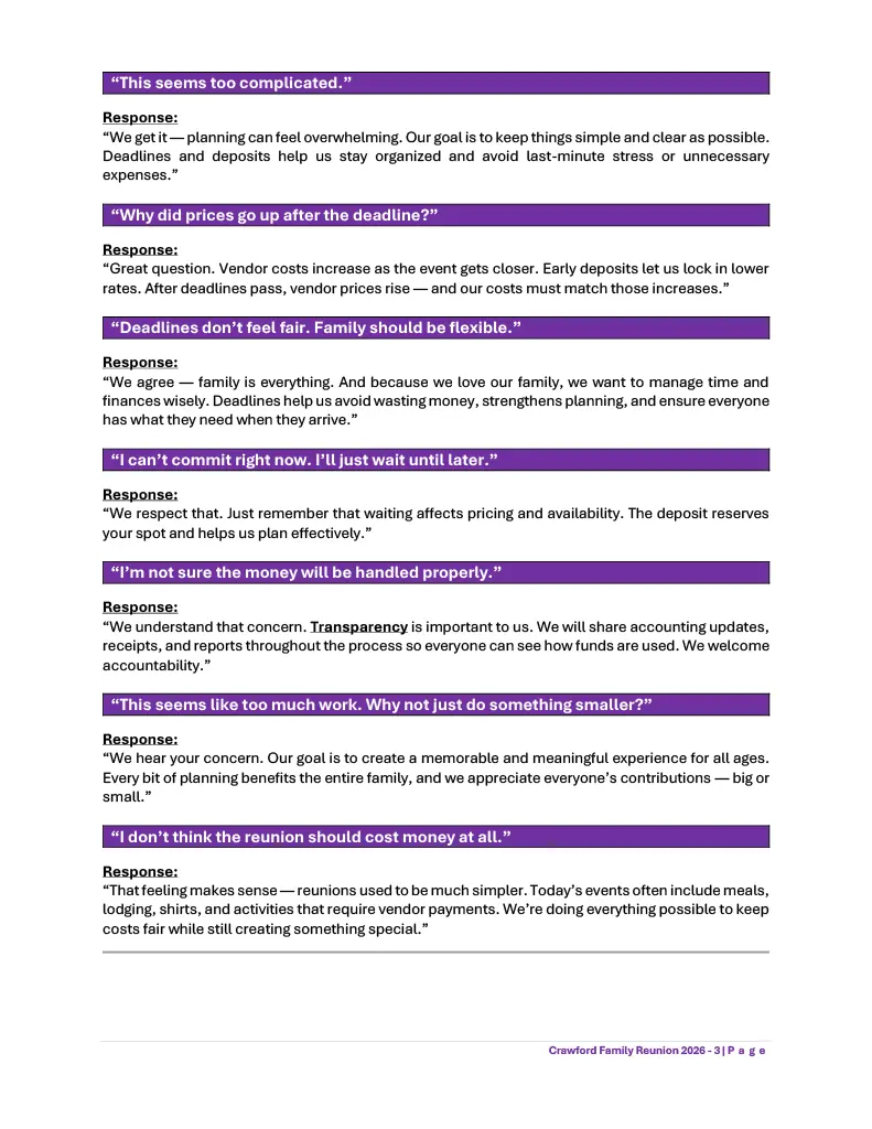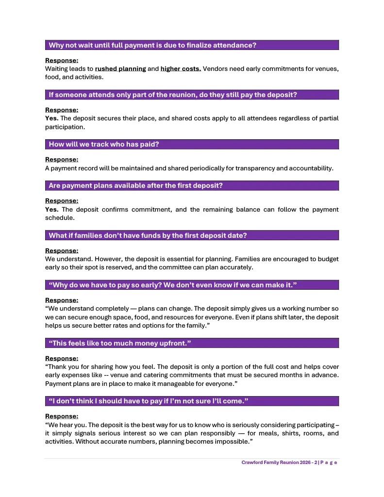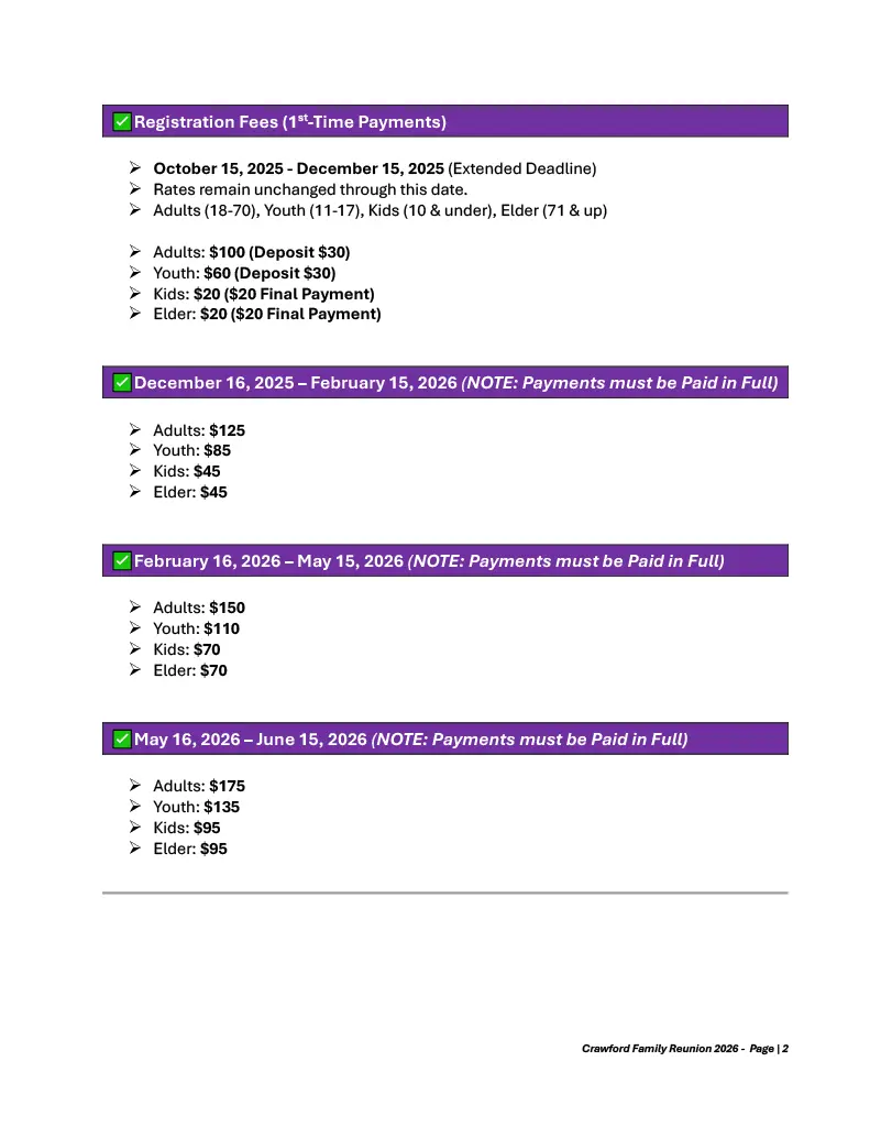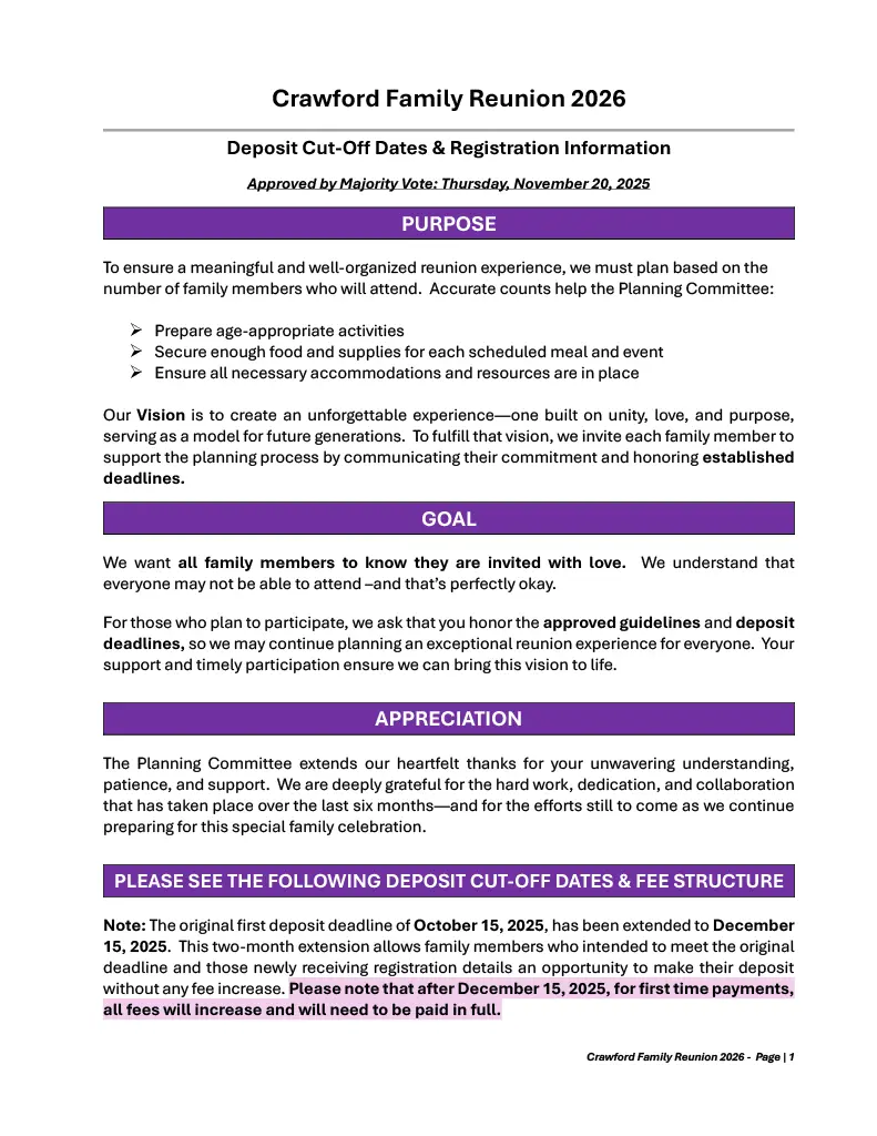 Crawford Family Reunion - Deposit Cut-Off Dates and Fee Structure (Approved 11-20-2025)